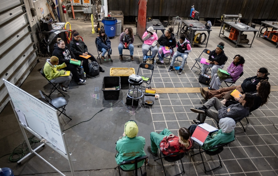IAW is well-positioned to do this work. Since 2014, the organization has cultivated talent and created opportunities for Pittsburgh-area youth and adults to enter the skilled trades, careers in the arts and other industries through hands-on sculpture design and welding programs. Its approach is rooted in four pillars: quality youth programming, investment in the Hazelwood community, an innovative approach to workforce development, and serving as an artist resource hub. IAW’s culture, which centers community, creativity and the whole person, made them a natural partner to pilot a young women–focused cohort built on a curriculum shaped through a gender equity lens.